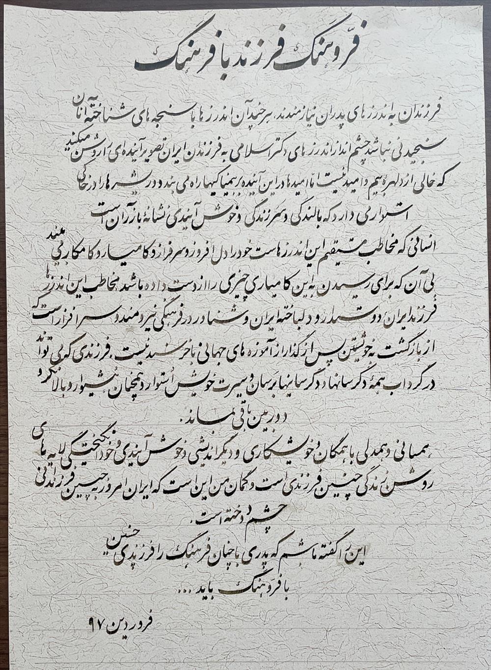 سرمشق جدید/ خوشا خاک ایران عنبر نسیم/ که خاکش گرامی تر از زر و سیم/ فردوسی